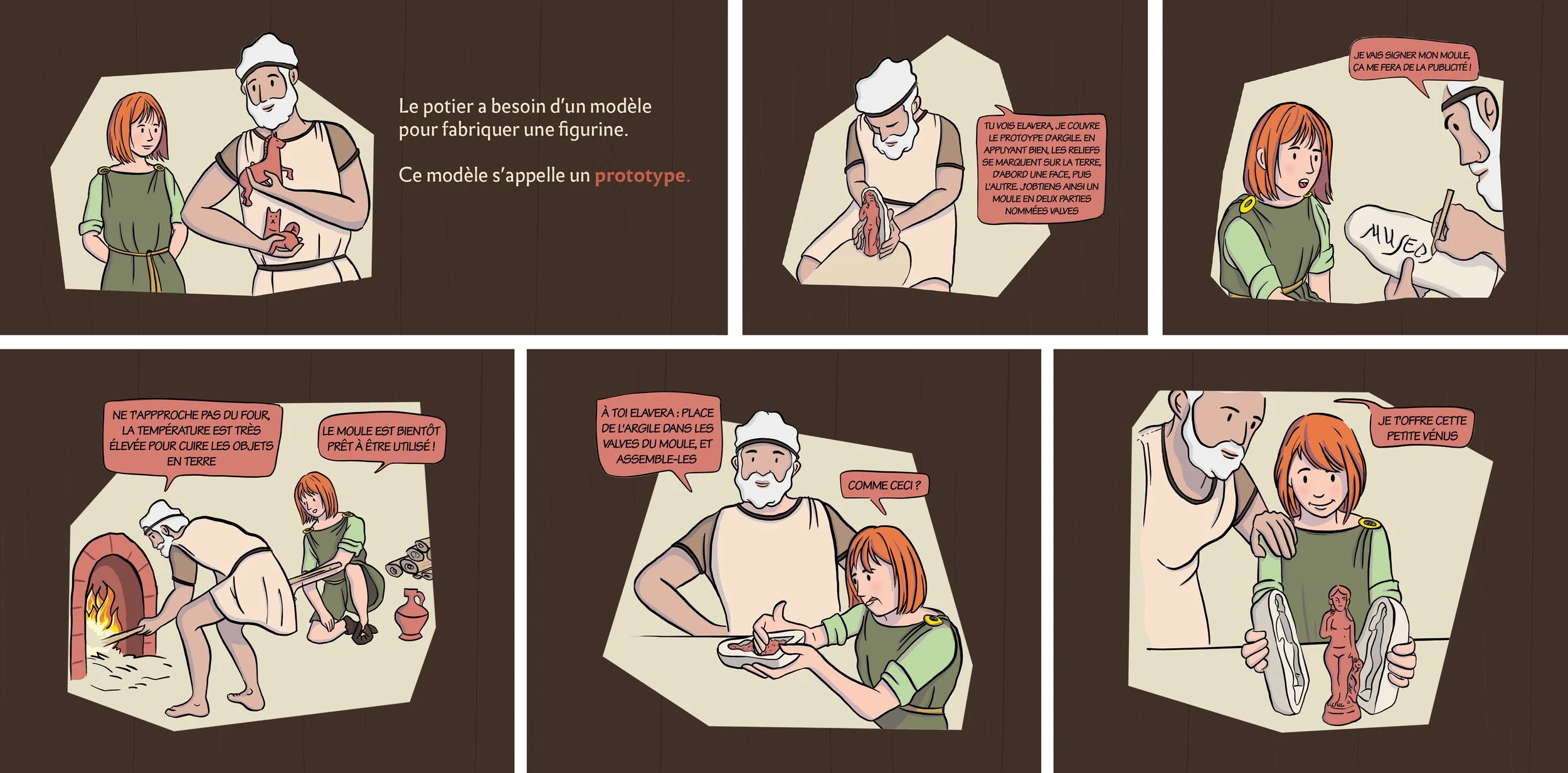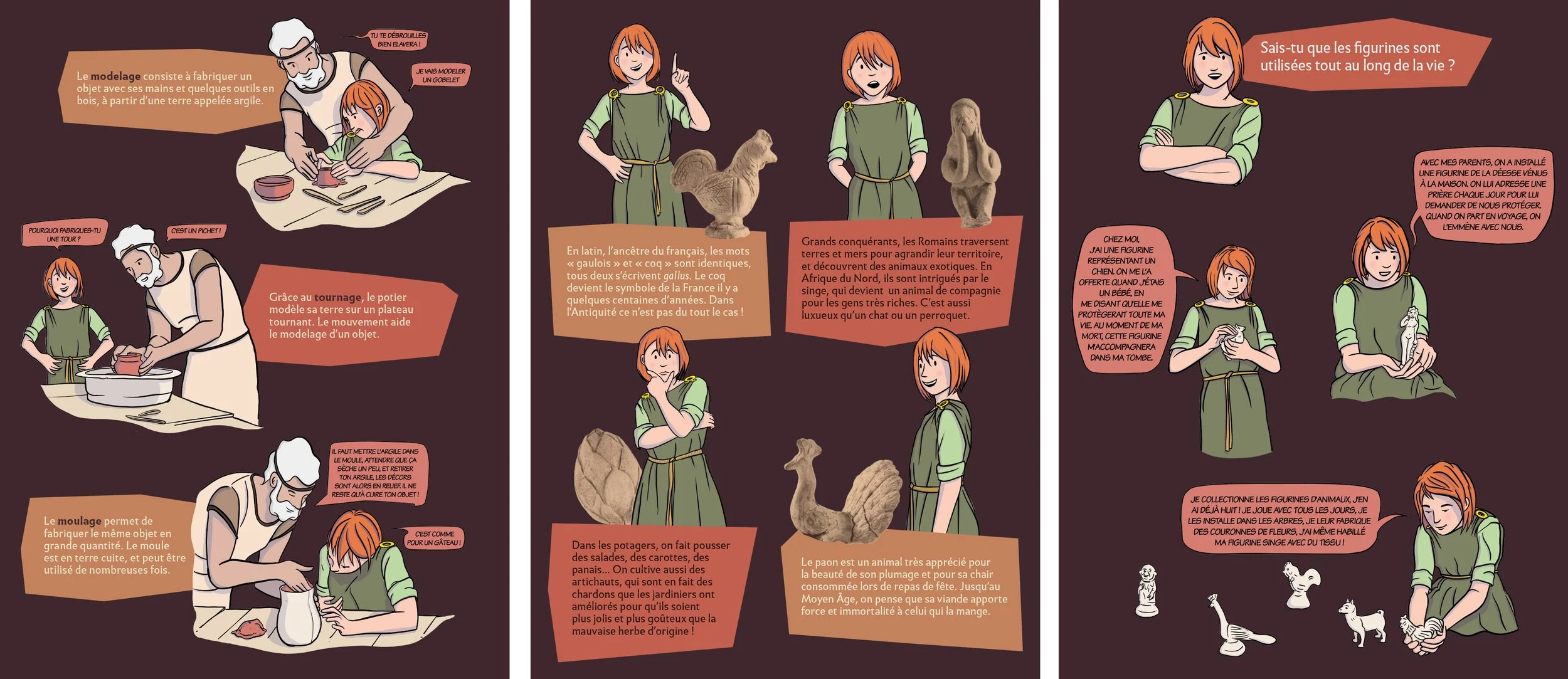 Le projet comportait la conception des supports informatifs propre à l’exposition (panneaux de salles, cartels…) mais aussi de nombreuses illustrations accompagnant un parcours pédagogique, avec notamment la représentation d’Elavera, petit fille gauloise qui se retrouve mise en scène tout au long du parcours.