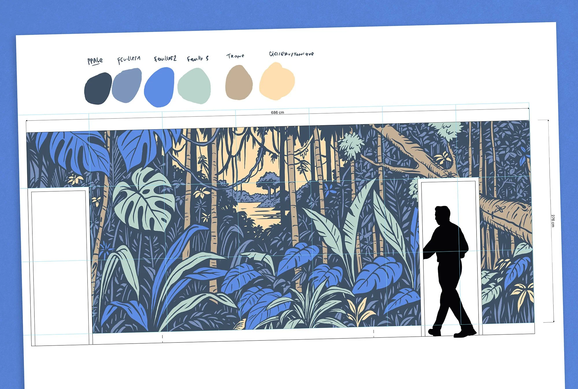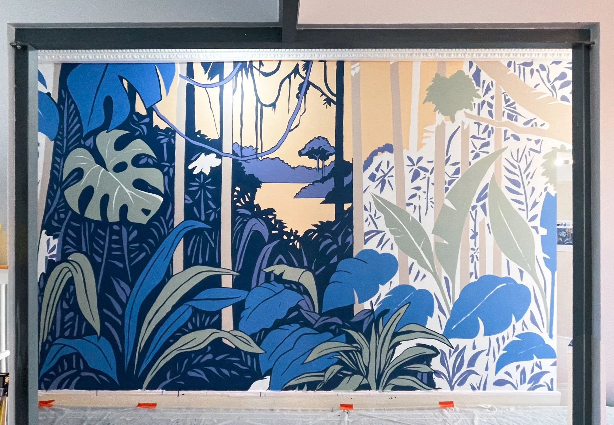 La fresque installe une lisière de forêt au cœur du mur. Un paysage dense de feuillages et de troncs élancés s’ouvre sur un horizon calme, comme une fenêtre vers ailleurs.