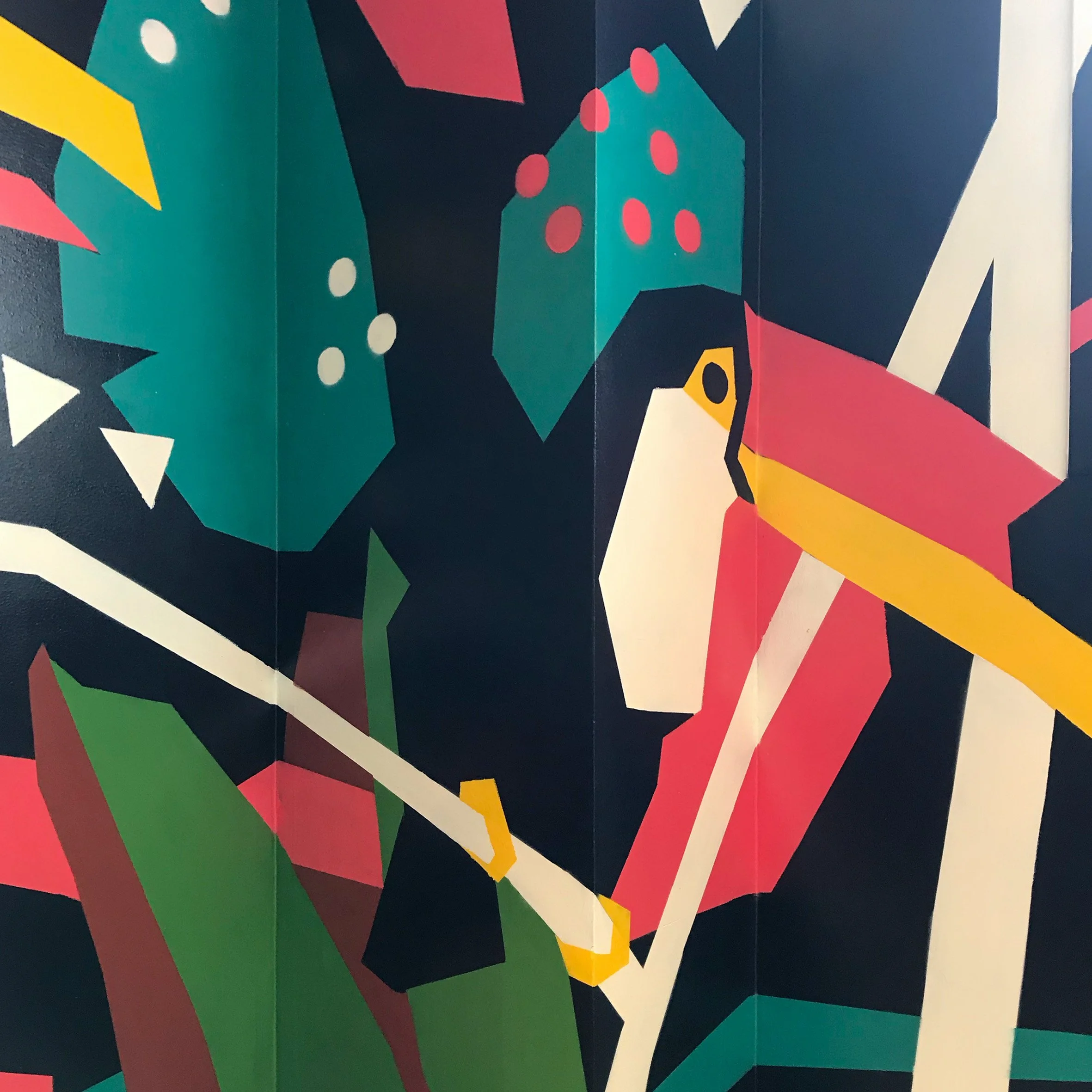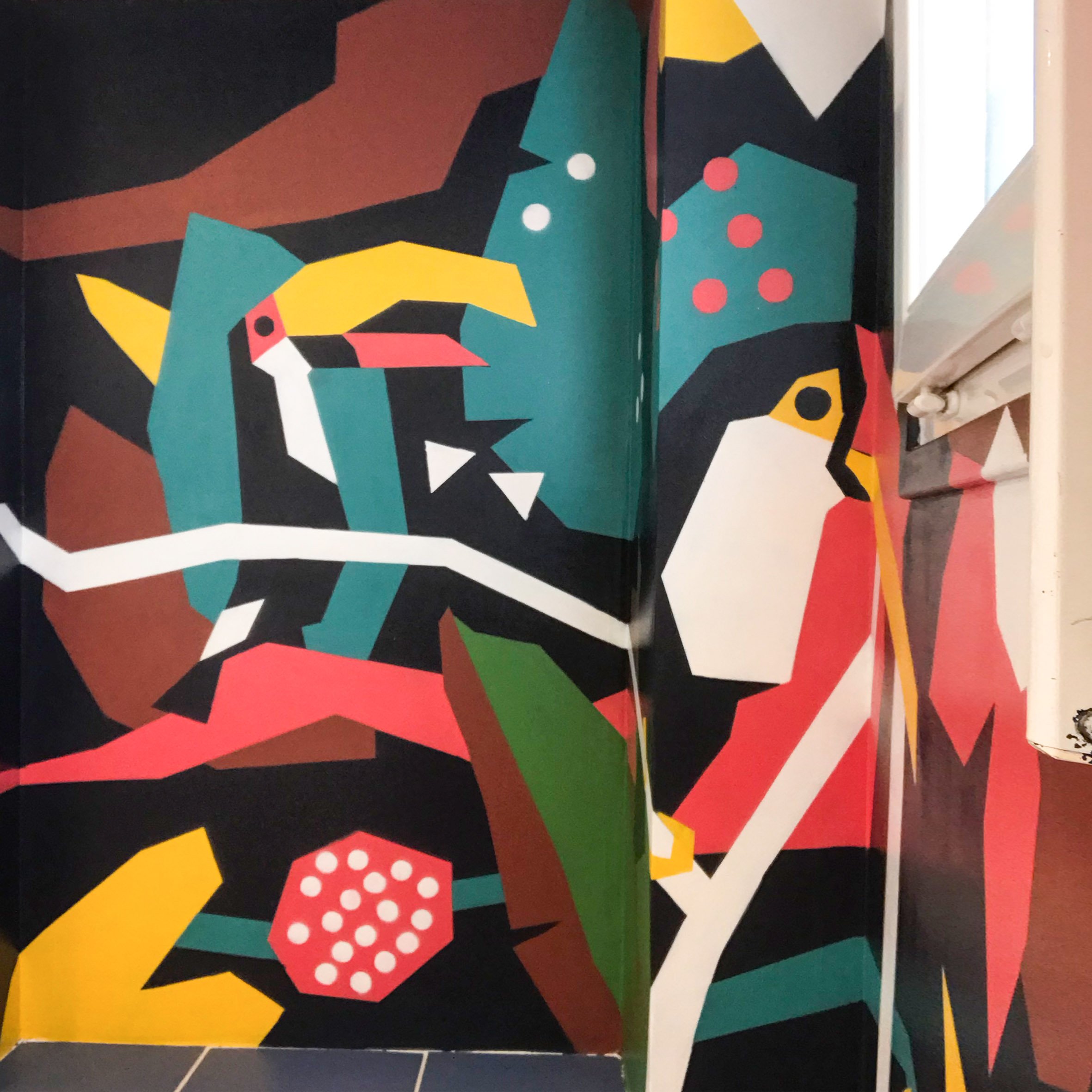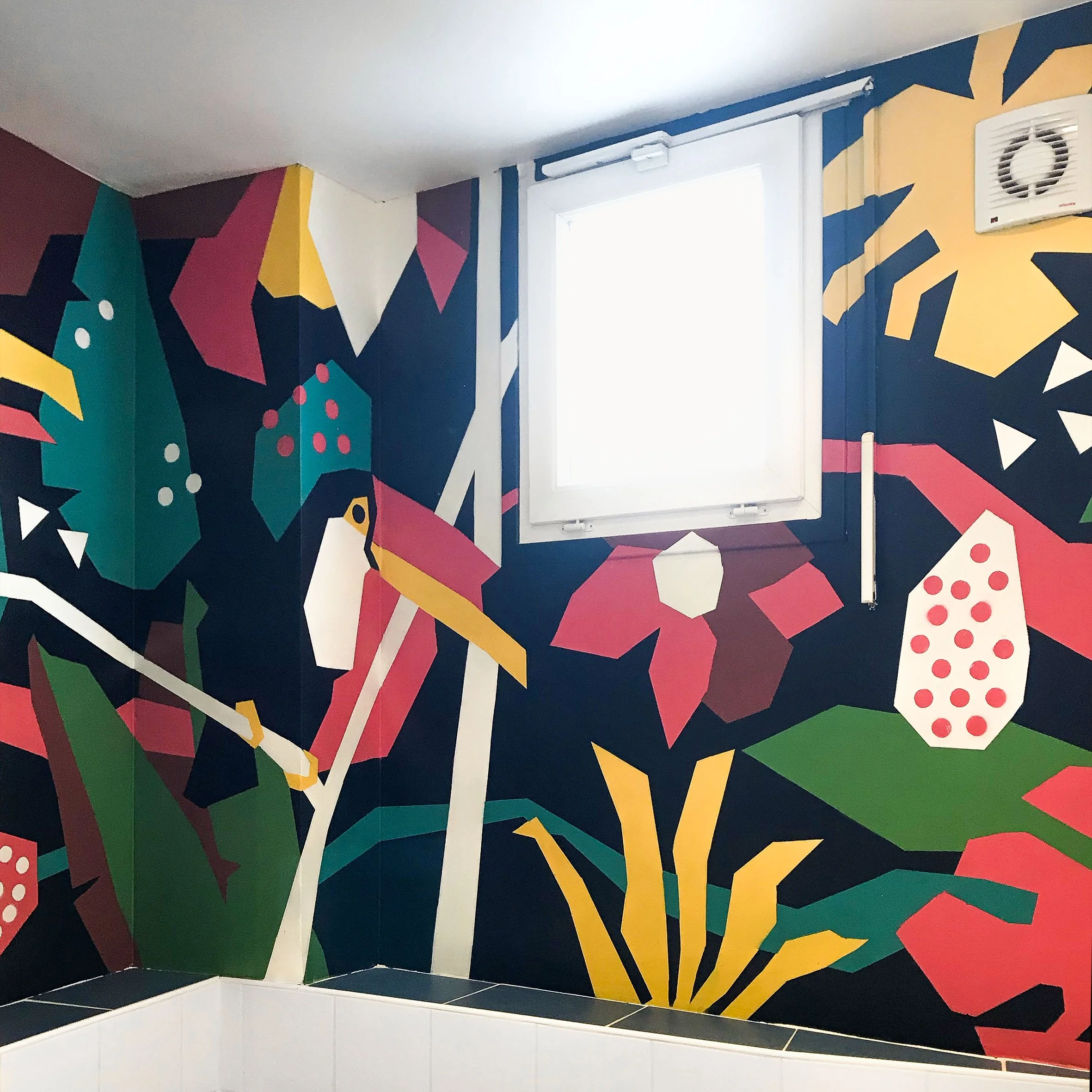 Inspirée par un univers végétal stylisé, la composition associe formes graphiques, couleurs contrastées et motifs tropicaux pour transformer cet espace fonctionnel en décor immersif.